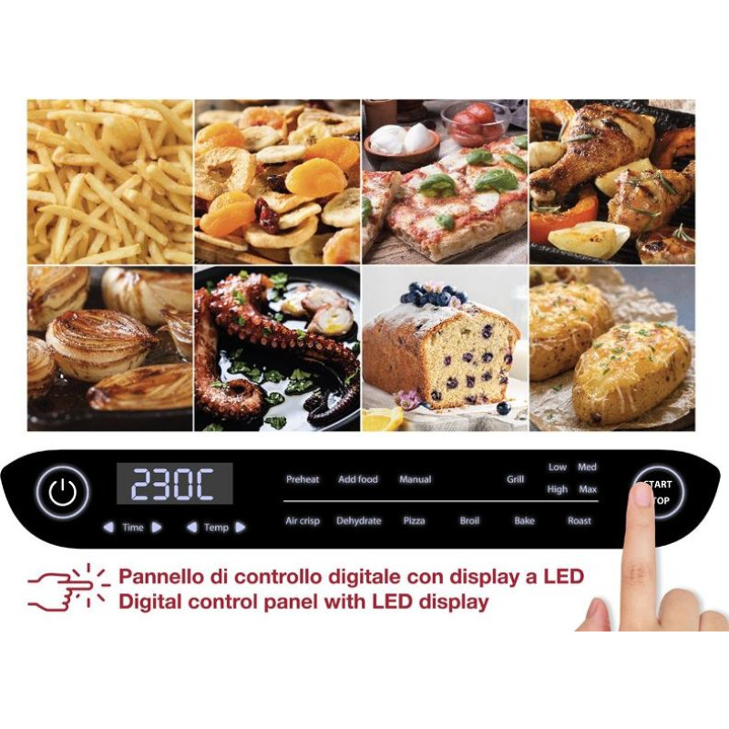 Your shopping cart is empty! Oil-Free Frying: Uses high-speed hot air circulation for healthier frying. 8 Cooking Programs: Air crisp, roast, grill (4 levels), dehydrate, bake, pizza, broil, and manual mode. Adjustable Settings: Temperature up to 230°C; timer up to 120 minutes (baking) and 24 hours (drying). Preheat Function: Ensures optimal cooking results with "Add Food" acoustic signal. Digital Control Panel: LED display for precise operation. Easy Maintenance: Anti-splash removable grid; non-stick pan and grid; double cleaning brush included. Safety Features: Automatic switch-off with acoustic signal at cooking end.