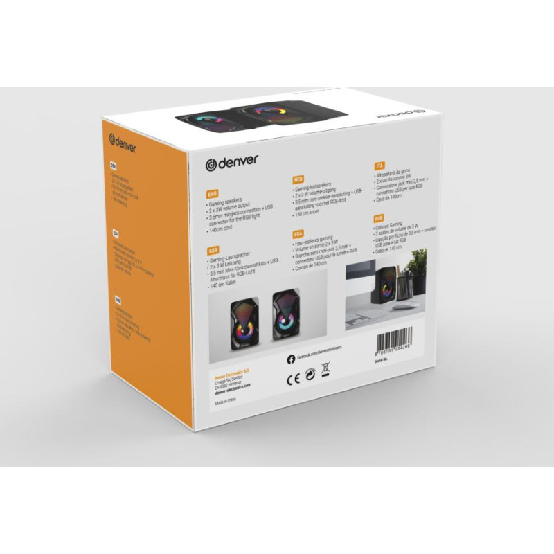 2.0 Spēļu skaļruņi ar gaismas funkciju Darbojas ar USB kabeli Audio savienojums ar 3,5mm spraudni Izejas jauda: 2 x 3W RMS RGB gaismas šovs 140cm vadi