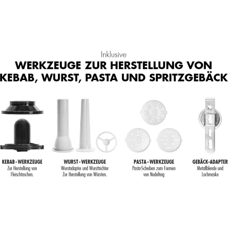 Jūsu iepirkumu grozs ir tukšs! Funkcijas 5,0 litru nerūsējošā tērauda maisīšanas bļoda Komplektā papildu 5,0 litru keramiskā maisīšanas bļoda, kas piemērota mikroviļņu krāsnīm un cepeškrāsnīm Jaudīgs 600 vatu līdzstrāvas augstas veiktspējas motors (ļoti kluss) Automātiska motora jaudas regulēšana smagai mīklai 12 ātruma iestatījumi un impulsa funkcija Planetārais maisītājs ar noslēgtu pilnmetāla piedziņu Divkāršs mīcīšanas āķis smagu mīklu apstrādei, piemēram, maizes mīklai, picas mīklai, mīcītai mīklai pīrāgu pamatnēm vai cepamajai mīklai Nerūsējošā tērauda putotājs dažādiem lietojumiem: saputo saldo krējumu, olu vai ātri pagatavojamo pudiņu un samīca dažādus vieglās mīklas veidus Maisīšanas āķis ar papildu maliņām, lai iejauktu iekšā miltus irdenā biskvītu mīklā, vai iejauktu ingredientus, piemēram, riekstus vai žāvētus augļus Komplektā gaļasmašīnas piederums: 3 perforēti diski (3mm / 5mm / 7mm), desu pildīšanas un cepumu stiprinājums, un četri dažādi makaronu diski mājās gatavotam fettuccine, spageti, linguine un makaroniem LED programmu displejs, LCD displejs ar atpakaļskaitīšanas funkciju Pamatīgs lieta alumīnija korpuss Aizsardzība pret šļakatām ar padeves atveri Tehniskie dati Strāvas padeve: 220-240V~ / 50-60Hz Jauda: 600 vati Strāvas vada garums: apm. 115 cm Svars: apm. 8 kg Izmēri: apm. 230 x 360 x 365 mm (P x D x A) Tilpums - maisīšanas trauks: maks. 5 litri maks. 1,5 kg miltu + 900 ml šķidruma Maks. darbības laiks: 10min - nepārtraukta darbība