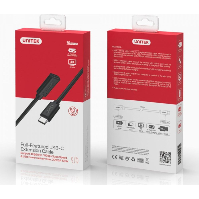 Unitek Przedłużacz usb-c 3.1 gen 2; 4k; pd 100w; 0,5m; m/f; c14086bk
