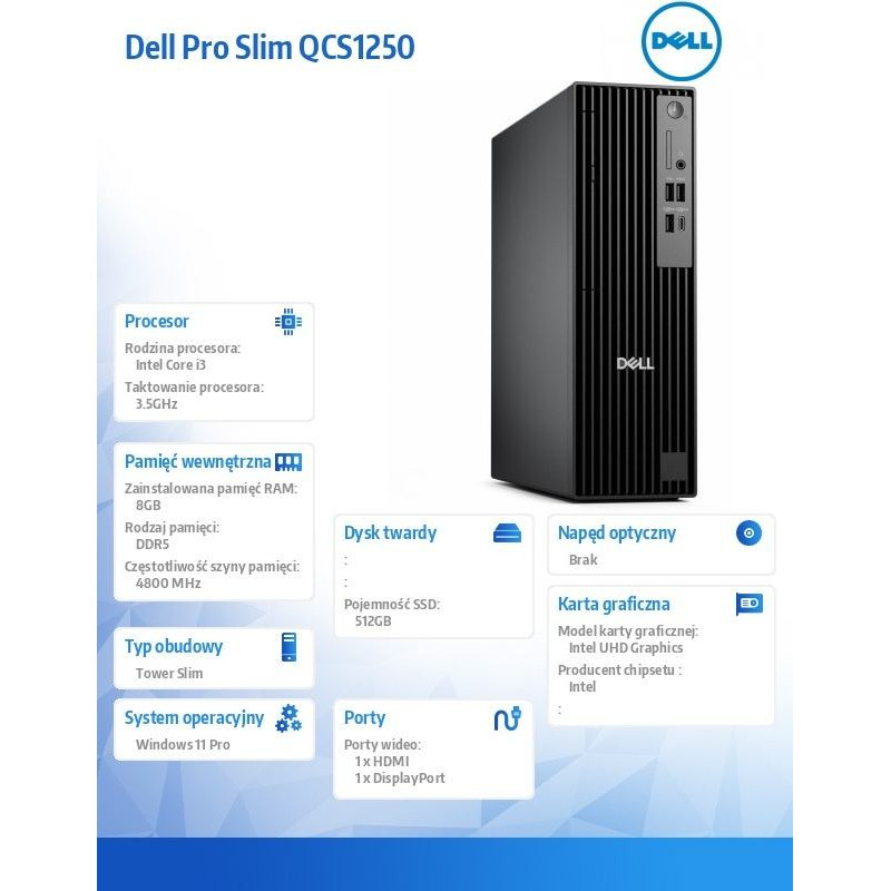 Jūsu iepirkumu grozs ir tukšs! Dell Komputer dell pro slim qcs1250 w11pro i3-14100/8gb/512gb ssd/interated/kb/mouse/3yps