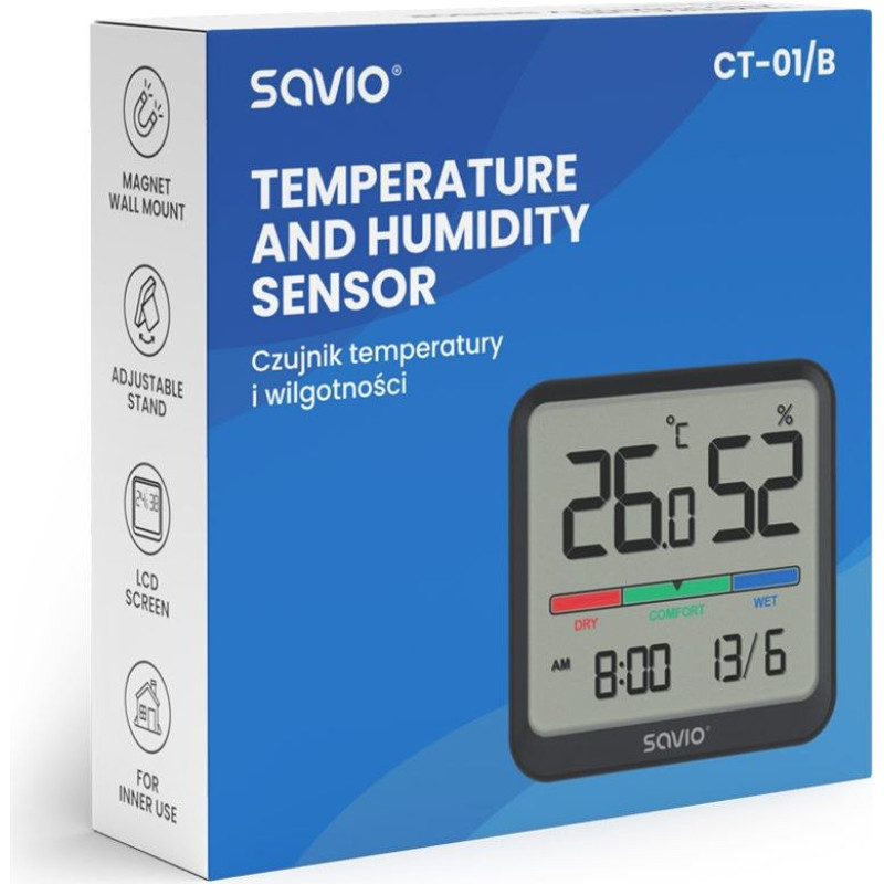 Savio Czujnik temperatury i wilgotności, do użytku wewnętrznego, ekran lcd, zegar, data, uchwyt z magnesem, ct-01/b czarny