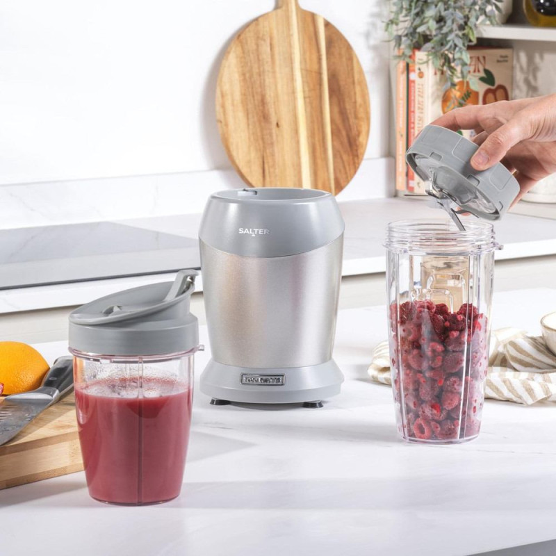 Jūsu iepirkumu grozs ir tukšs! Personīgais blenderis: Sāciet savu dienu ar Salter Aspen NutriPro blenderi! Kompakts dizains ar 1L ietilpību vienas porcijas dzērieniem. Sasmalciniet, sadrupiniet un sablenderējiet: viegli pagatavojiet smūtijus, proteīna kokteiļus vai kokteiļus veselīgam dzīvesveidam. Esot ceļā: komplektā ir iekļauta 800 ml BPA nesaturoša ceļojumu krūze ar viegli lietojamu dzeršanai vāku ērtībai. Precīza sajaukšana: 6 spārnu nerūsējošā tērauda asmens vienmērīgiem, ideāli sajauktiem dzērieniem. Viegli lietojams un tīrāms: jaudīgs 1000 W motors izturīgiem superproduktiem un vienkāršai tīrīšanai ar rokām.